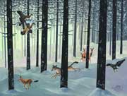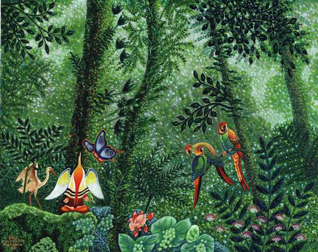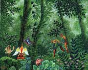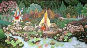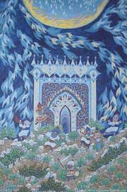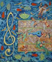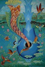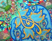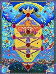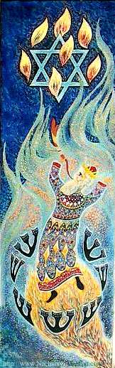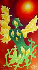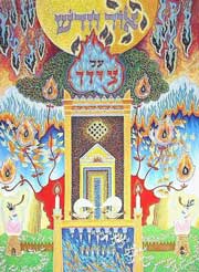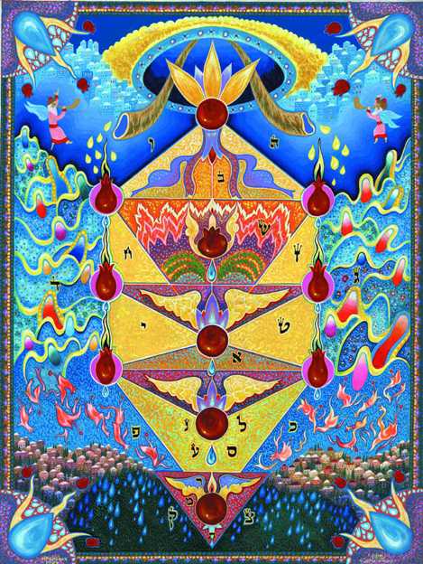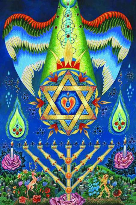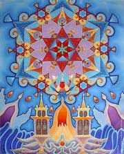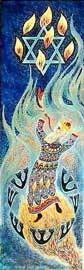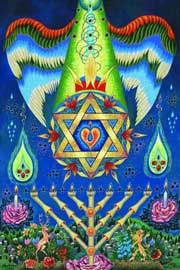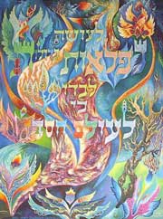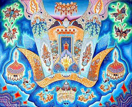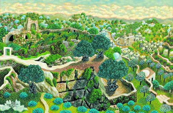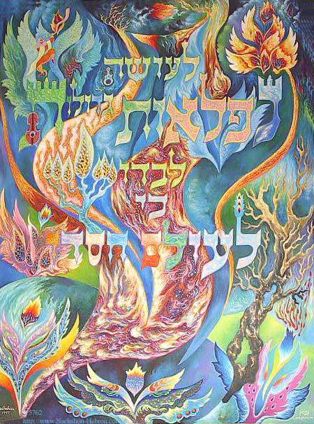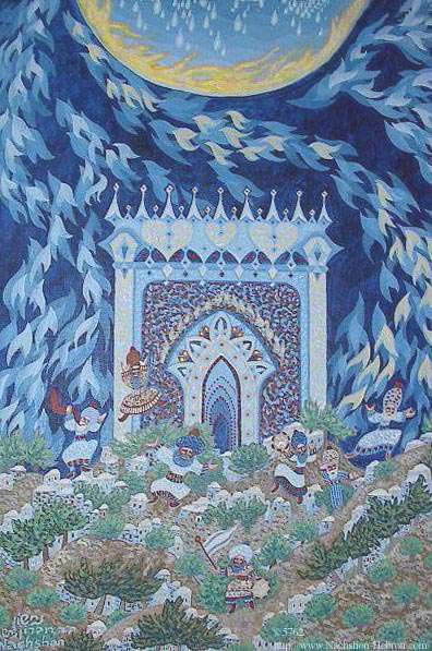 Original paintings by Baruch Nachshon Baruch Nachshon was given a grant to study painting in New York by the last Lubavitch Rebbe, and he was the only artist to exhibit at Lubavitch world headquarters in Brooklyn. Mr. Nachshon was among the first Jewish settlers of Hebron in 1967, and opened a gallery next to the Cave of the Patriarchs in the 1970s. Nachshon continues to paint in his studio in Kiryat Arba, overlooking the city of Hebron, and he is always happy to welcome visitors. Baruch Nachshon's work is rife with overt mysticsm and bright, colorful imagery. His favorite motifs include the flow of divine benevolence through creation, and the joy of the creations- usually symbolized by dancing Hassidim, soaring angels or living animals. His style employs a lush and vivid color pallette, much movement and geometric repetition and symbolic elements which recur throughout his ouvre. The pieces presented below are selected from Mr.Nachshon's vast catalog of works. Most of them are available for purchase, but they have been selected as much for their depiction of a particular theme or trend in Mr. Nachshon's eclectic and expansive repetoire. Many more digital examples are available, as well as some reproductions. Contact Redemption Media for more information. All of the original paintings are acrylic on canvas, click on a picture to see it enlarged.